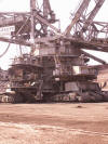 Im 10 Minutentakt fahren hier die Shuttle-Busse. Schon wenige Kilometer von Bedburg-Kaster gelangt man zum Eingang von Garzweiler I. Die Größe dieses Abbaugebietes beträgt ca. 5 km in der Länge und 3 km in der Breite. Alles ist riesig und überdimensional. Den Anfang macht die Verladestation. Über kilometerlange Förderbänder wird die Braunkohle transportiert und dort in die Waggons geladen. Braunkohle ist eine sehr staubige Angelegenheit. Entlang der Fahrroute stehen zahlreiche Bewässerungsanlagen. Der Bus fährt direkt an einem der Giganten, einem Braunkohlebagger vorbei. Stolze 100 Mill. Euro kostet so ein Ungetüm, der sich unaufhörlich in das Erdreich frisst. Die Ketten erreichen ohne weiteres die Höhe unseres Busses und ein Radlader, sieht eher sehr bescheiden gegen dieses Schaufelrad aus. |