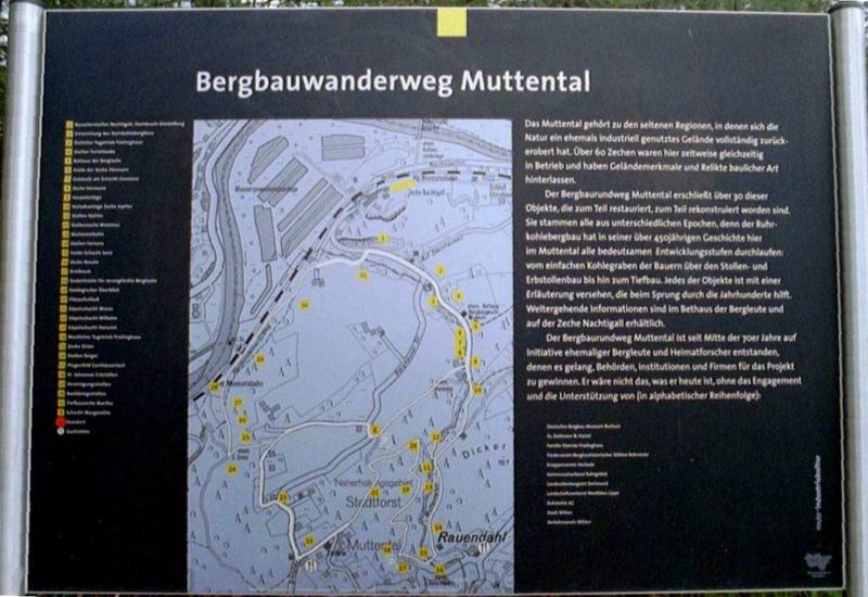 Bevor 1976 die letzte Zeche auf Wittener Stadtgebiet ihre Tore schloß, durchwühlten Bergleute die Erde mehr als 450 Jahre lang auf der Suche nach dem begehrten Bodenschatz Steinkohle und hinterließen dabei deutliche Spuren in Form von Geländemerkmalen und baulichen Überresten. Heute führt ein 9 km langer Rundweg durch das Grün der südlichen Ruhrberge, vorbei an alten Stollen, Förderanlagen und Zechengebäuden. |
