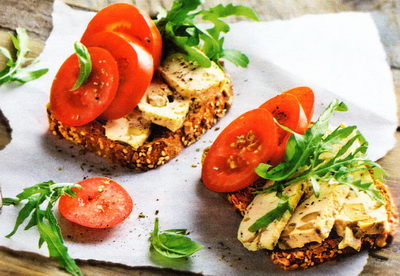 Brotscheiben mit Tofu und Tomaten