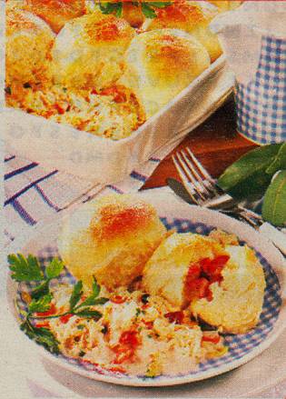 erhitzen. Die Mischung über die Klöße gießen. Im vorgeheizten