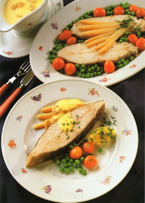 Fisch mit dem gemüse auf einer vorgewärmten Platte anrichten, die