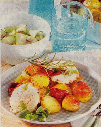 Kartoffelpfanne mit Rosmarin und Majoran garnieren. Gurkensalat