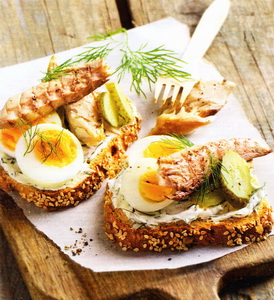 Quark-Dill-Creme bestreichen. Mit Ei- und Gurkenscheiben