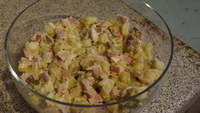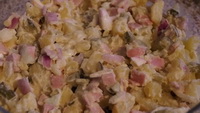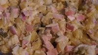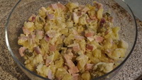 Kartoffelsalat schön saftig, ein Teil davon zieht außerdem in die