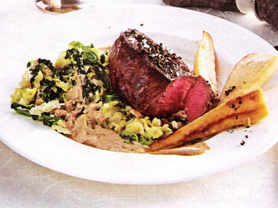 Soße und Kohl würzen. Mit Medaillons und Pastinaken anrichten