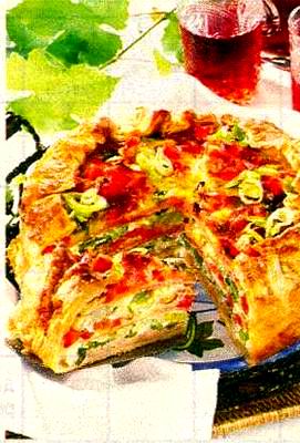 den boden streichen. Porree, Schinken und Käse in Scheiben, mit