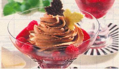 Tuff in jedes Dessertglas spritzen. Mit den Schoko-Dekor-Blättern